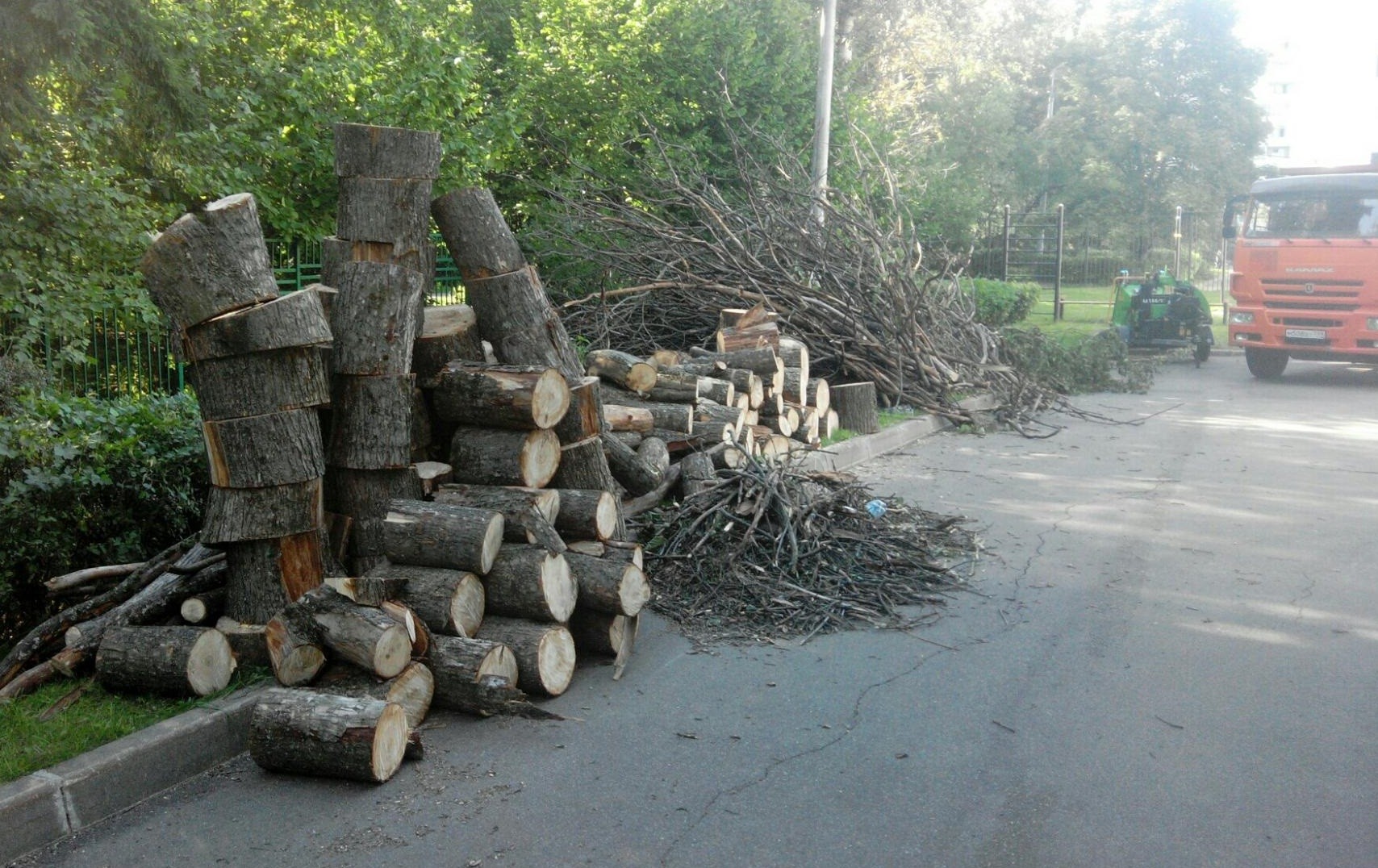 По желанию заказчика, уберем за собой территорию, соберем ветки, листву в кучи. Если нужно, вывезем распиленные деревья или сложим их в поленницу.